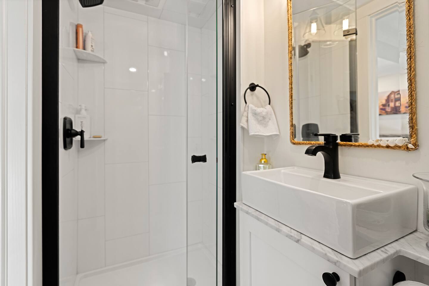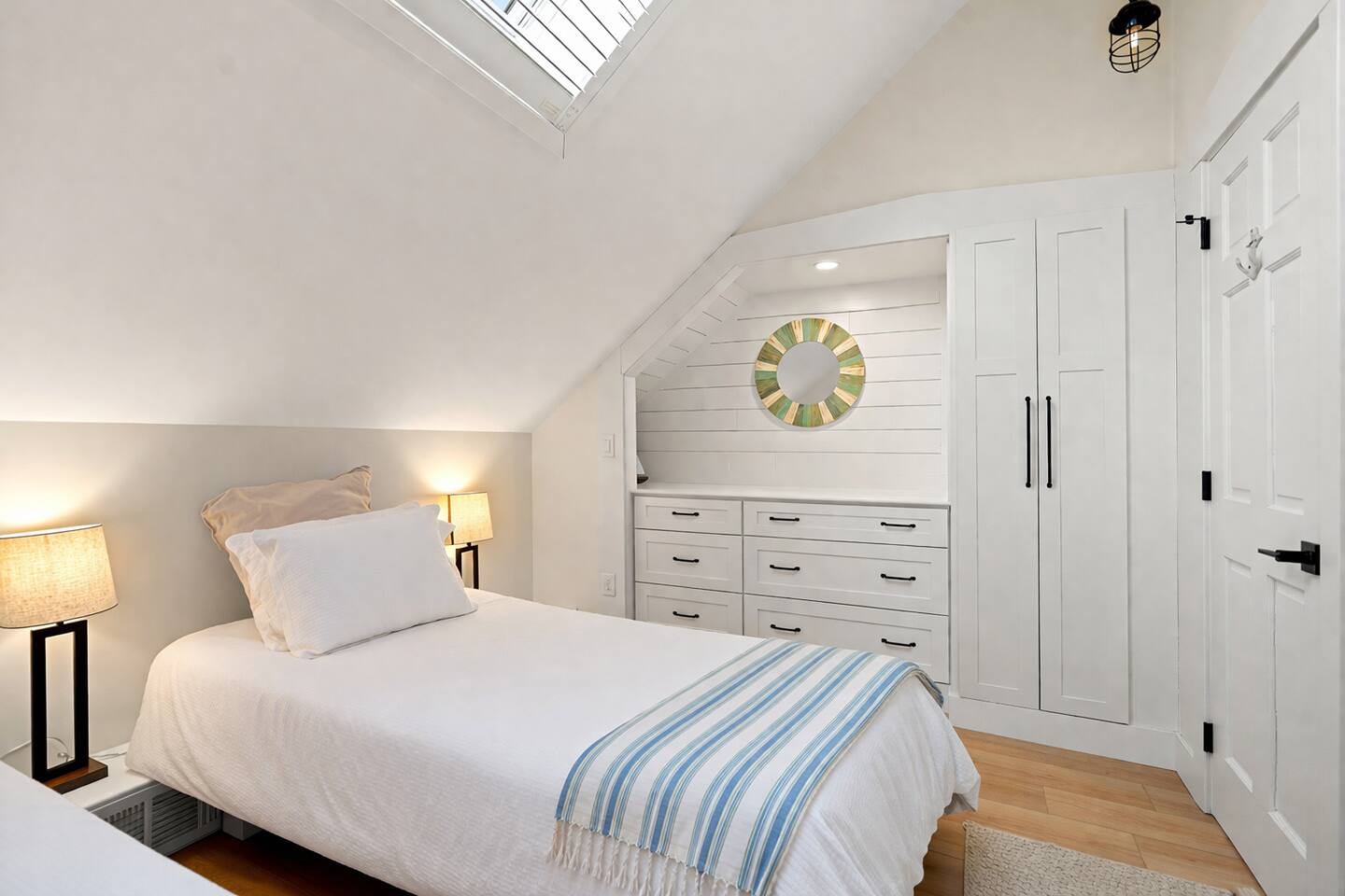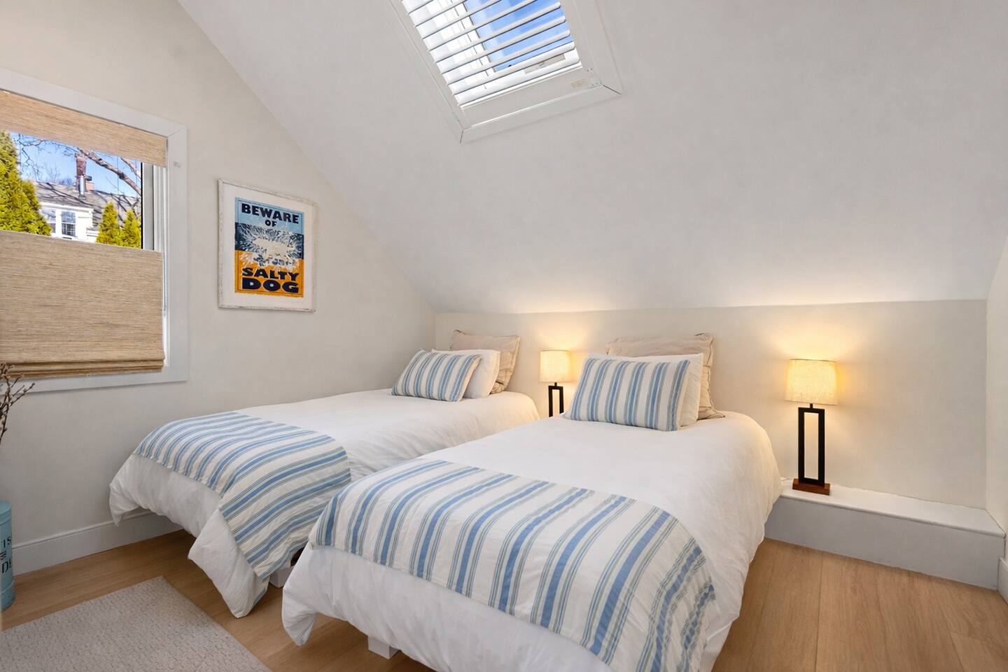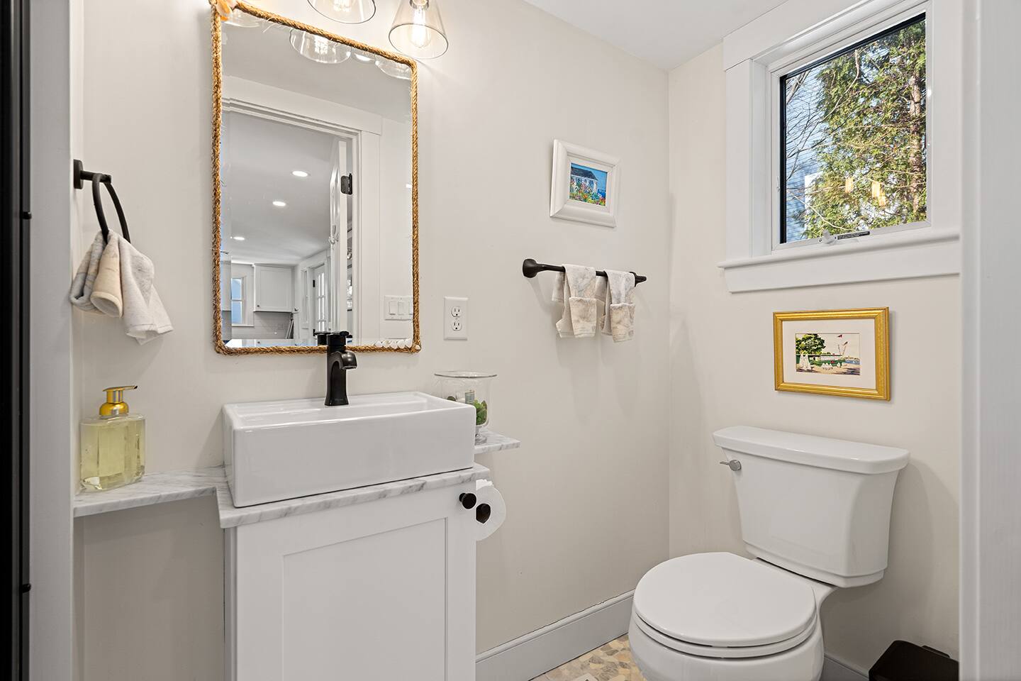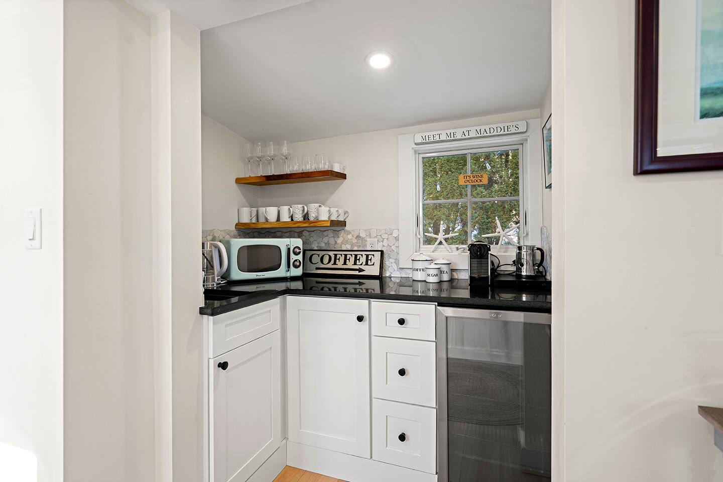 BEDROOMS: Sleeping Arrangements (Sleeps 6): Primary Bedroom - second floor (sleeps 2) - Queen-sized bed - Large bureau - Hanged Clothing Storage - Dedicated Workspace Queen Bedroom - second floor (sleeps 2) - Queen-sized bed - Under-bed drawer system Twin Beds - second floor (sleeps 2) - Twin beds - Built-in bureau - Closet HIGHLIGHTS: • Deck off Kitchen Area • Gas Fire Pit • Centrally-located • Spacious Eat-in Kitchen • Stainless Steel Appliances • 2-Car Off-Street Parking • Wet Bar Area BATHROOMS: • One Full Bath with Shower (first floor) • One Full Bath with Tub/Shower Combo (second floor) KITCHEN: • Granite counters • Stainless Steel Appliances • Microwave • Drip Coffeemaker • Electric Tea Kettle • Gas Range • Dishwasher • Cutlery • Cookware • Silverware • Wine Glasses • Coffee Mugs • Glassware • Dinnerware • Paper Towels • Dish Soap • Hand Soap • Sponge • Trash Bags • Dishwasher Tabs OUTDOORS: • OutdoorTable/Chairs • Outdoor Lounging Area • Fire Pit Area • Gas Grill GENERAL: • Bath, Hand and Face Towels • Shampoo and Conditioner • Body Wash • Sheets • Pillows • Duvet Covers • Fleece Blankets Step into a beautifully designed three-bedroom cottage where classic coastal charm meets thoughtful modern comfort. The stainless steel kitchen feels both open and inviting, seamlessly flowing onto a charming shaded deck overlooking a private backyard—perfect for morning coffee in the sunlight as you take in the landscaped surroundings. The front living space is vibrant yet cozy, enhanced by timeless shiplap walls and warm exposed beams that create an airy, relaxed atmosphere. A convenient half bath and wet bar complete the main level, making it ideal for effortless entertaining and unwinding after a day by the water. Upstairs, all three bedrooms offer a peaceful retreat beneath soaring ceilings and architectural character. The primary bedroom features a plush queen bed, cathedral ceilings and a dedicated workspace. Two additional bedrooms — one with a queen bed and one with two twins — provide inviting spaces for guests.