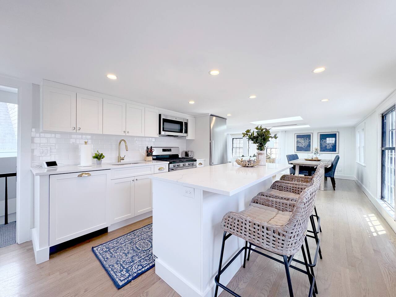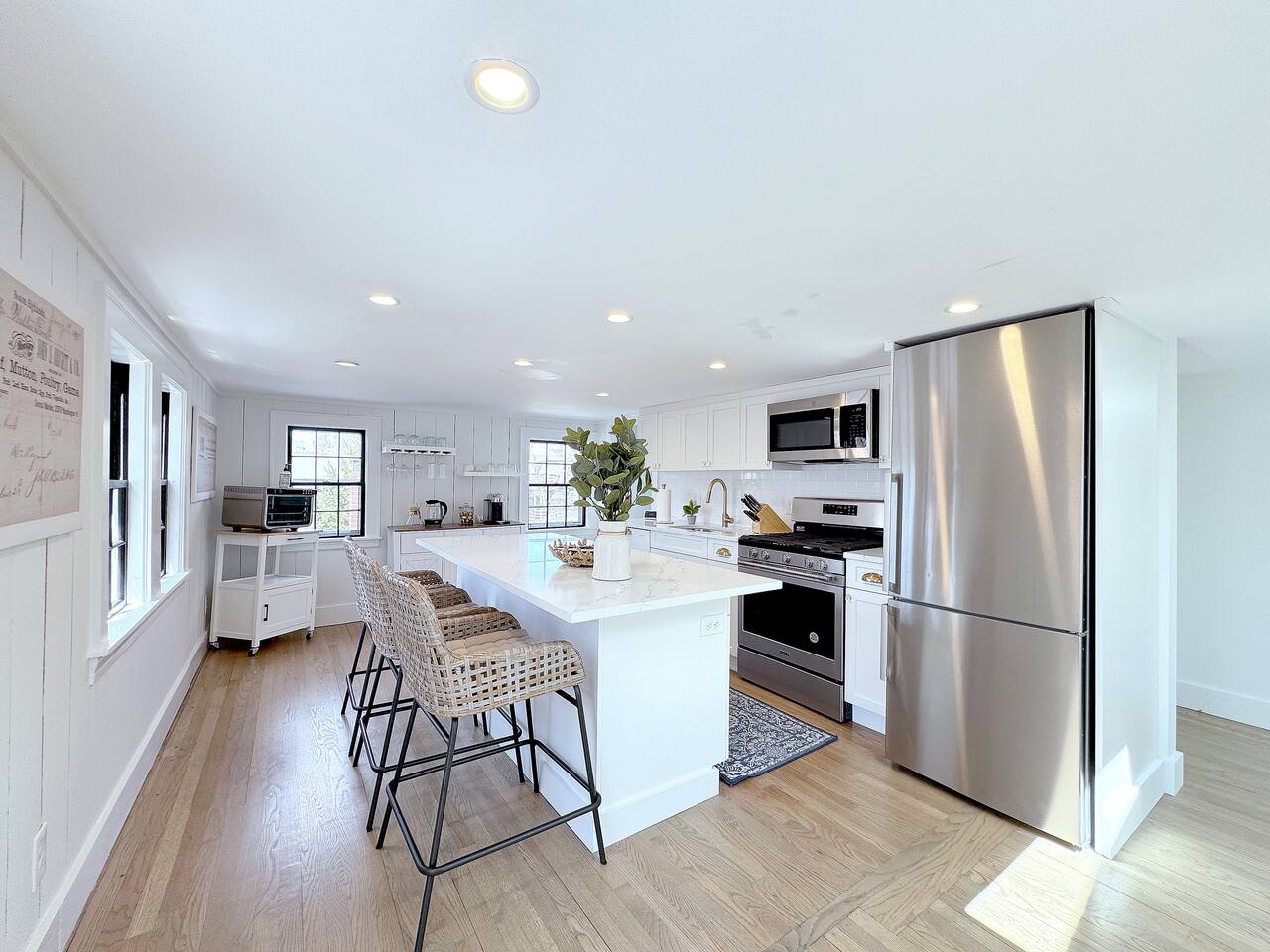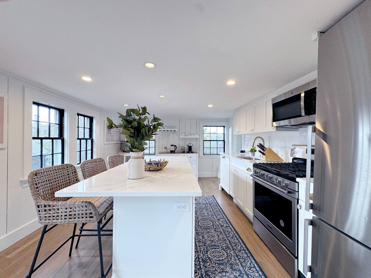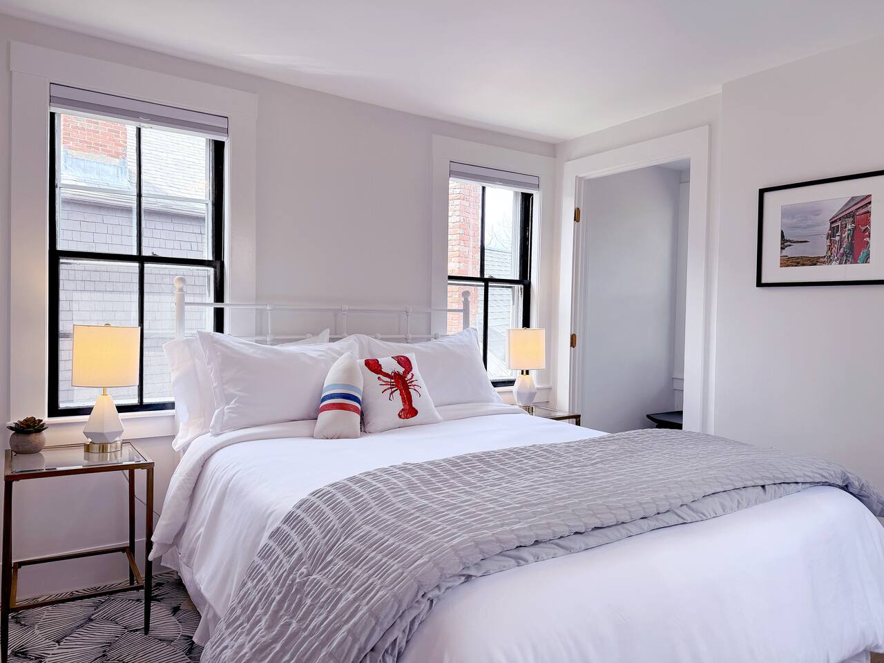 Sleeping Arrangements (Sleeps 4): Primary Bedroom - first floor (sleeps 2) - King-sized bed - Ensuite bath - Large bureau Queen Bedroom - first floor (sleeps 2) - Queen-sized bed - Medium-sized bureau BATHROOMS: • Full Bathroom - first floor • Full Bathroom - second floor KITCHEN: • Large Quartz Island • Stainless Steel Appliances • Nespresso Coffeemaker/Pods • Pour Over Coffee Decanter • Electric Tea Kettle • Gas Range • Dishwasher • Cutlery • Cookware • Silverware • Wine Glasses • Coffee Mugs • Glassware • Dinnerware • Paper Towels • Dish Soap • Hand Soap • Sponge • Trash Bags • Dishwasher Tabs OUTDOORS: • Outdoor Lounging Area on Roofdeck - Seats 4 GENERAL: • Bath, Hand and Face Towels • Shampoo and Conditioner • Body Wash • Sheets • Pillows • Duvet Covers • Fleece Blankets To access the condo, you must enter on the main level and go up a flight of carpeted spiral stairs to the entrance to the unit. The main level features two bedrooms, a sitting room, washer/dryer, office space and full bath. There is also access to the private outdoor deck on this floor. To access the living room, dining room, kitchen and another full bath, head up an interior set of carpeted spiral stairs to the second floor and take full advantage of the views of the harbor from the living room area. Two off-street tandem parking spaces included (will accommodate two medium-sized cars).