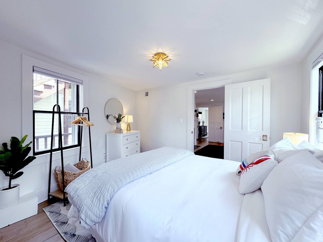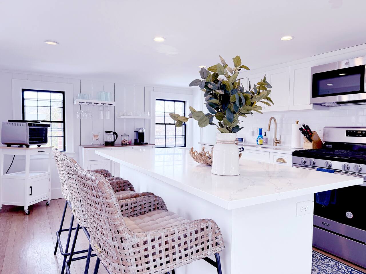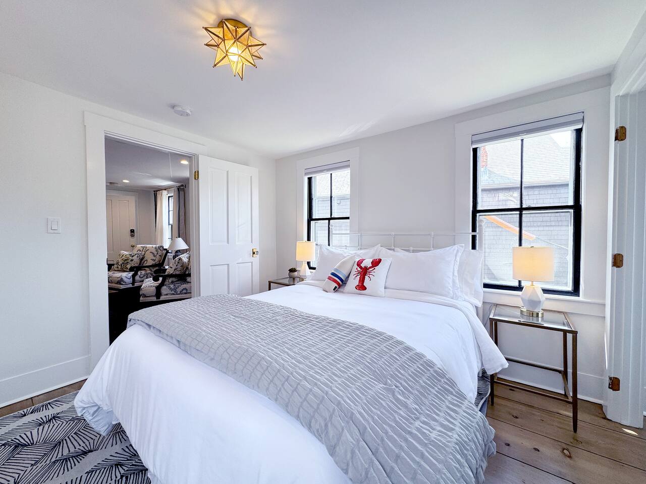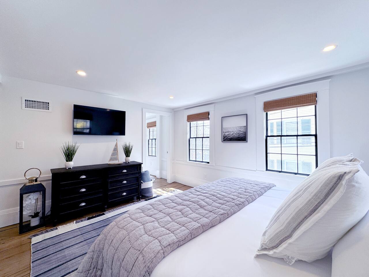 Sleeping Arrangements (Sleeps 4): Primary Bedroom - first floor (sleeps 2) - King-sized bed - Ensuite bath - Large bureau Queen Bedroom - first floor (sleeps 2) - Queen-sized bed - Medium-sized bureau BATHROOMS: • Full Bathroom - first floor • Full Bathroom - second floor KITCHEN: • Large Quartz Island • Stainless Steel Appliances • Nespresso Coffeemaker/Pods • Pour Over Coffee Decanter • Electric Tea Kettle • Gas Range • Dishwasher • Cutlery • Cookware • Silverware • Wine Glasses • Coffee Mugs • Glassware • Dinnerware • Paper Towels • Dish Soap • Hand Soap • Sponge • Trash Bags • Dishwasher Tabs OUTDOORS: • Outdoor Lounging Area on Roofdeck - Seats 4 GENERAL: • Bath, Hand and Face Towels • Shampoo and Conditioner • Body Wash • Sheets • Pillows • Duvet Covers • Fleece Blankets To access the condo, you must enter on the main level and go up a flight of carpeted spiral stairs to the entrance to the unit. The main level features two bedrooms, a sitting room, washer/dryer, office space and full bath. There is also access to the private outdoor deck on this floor. To access the living room, dining room, kitchen and another full bath, head up an interior set of carpeted spiral stairs to the second floor and take full advantage of the views of the harbor from the living room area. Two off-street tandem parking spaces included (will accommodate two medium-sized cars).