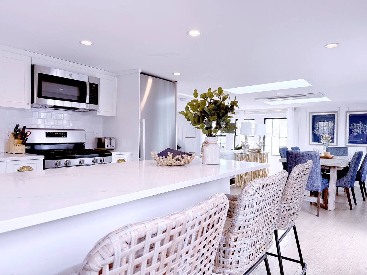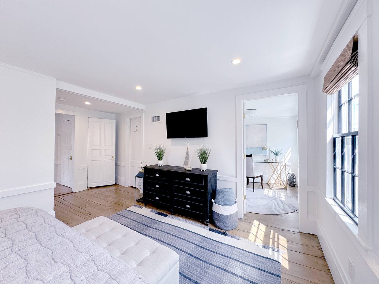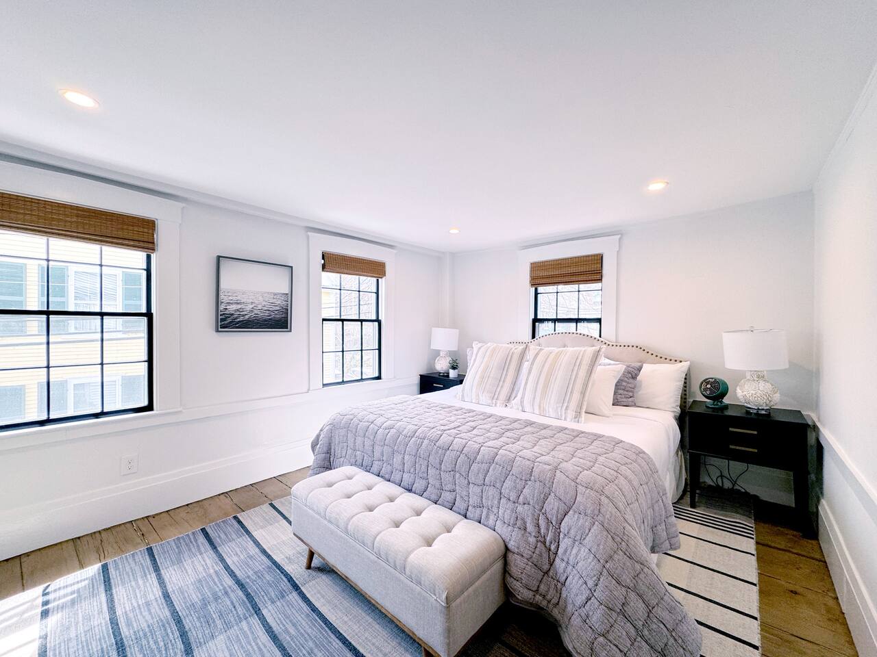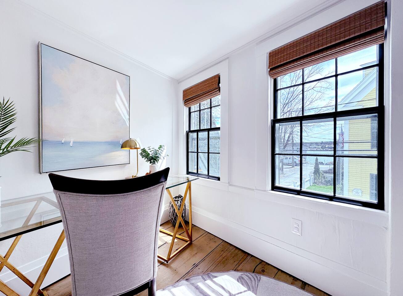Sleeping Arrangements (Sleeps 4): Primary Bedroom - first floor (sleeps 2) - King-sized bed - Ensuite bath - Large bureau Queen Bedroom - first floor (sleeps 2) - Queen-sized bed - Medium-sized bureau BATHROOMS: • Full Bathroom - first floor • Full Bathroom - second floor KITCHEN: • Large Quartz Island • Stainless Steel Appliances • Nespresso Coffeemaker/Pods • Pour Over Coffee Decanter • Electric Tea Kettle • Gas Range • Dishwasher • Cutlery • Cookware • Silverware • Wine Glasses • Coffee Mugs • Glassware • Dinnerware • Paper Towels • Dish Soap • Hand Soap • Sponge • Trash Bags • Dishwasher Tabs OUTDOORS: • Outdoor Lounging Area on Roofdeck - Seats 4 GENERAL: • Bath, Hand and Face Towels • Shampoo and Conditioner • Body Wash • Sheets • Pillows • Duvet Covers • Fleece Blankets To access the condo, you must enter on the main level and go up a flight of carpeted spiral stairs to the entrance to the unit. The main level features two bedrooms, a sitting room, washer/dryer, office space and full bath. There is also access to the private outdoor deck on this floor. To access the living room, dining room, kitchen and another full bath, head up an interior set of carpeted spiral stairs to the second floor and take full advantage of the views of the harbor from the living room area. Two off-street tandem parking spaces included (will accommodate two medium-sized cars).